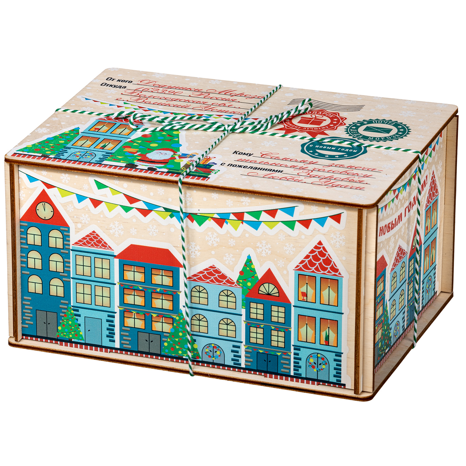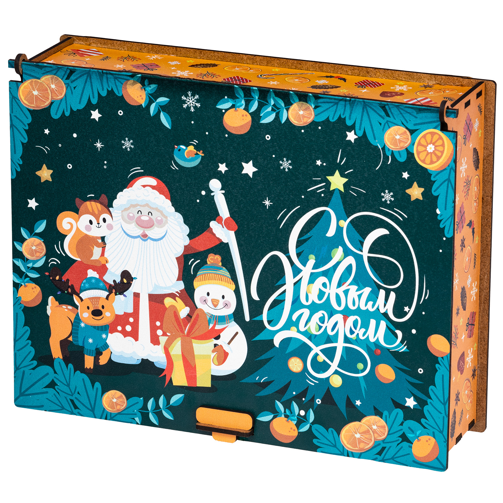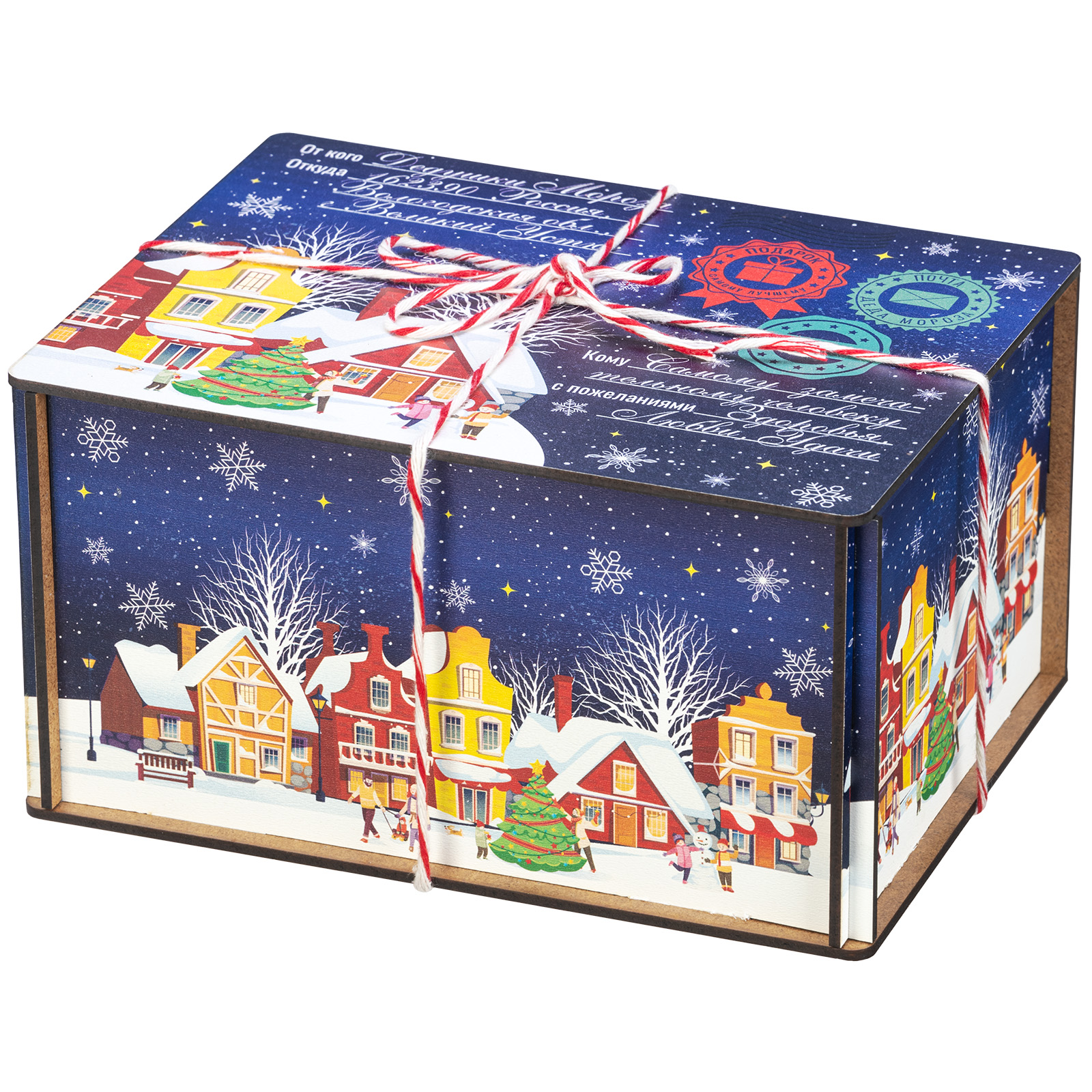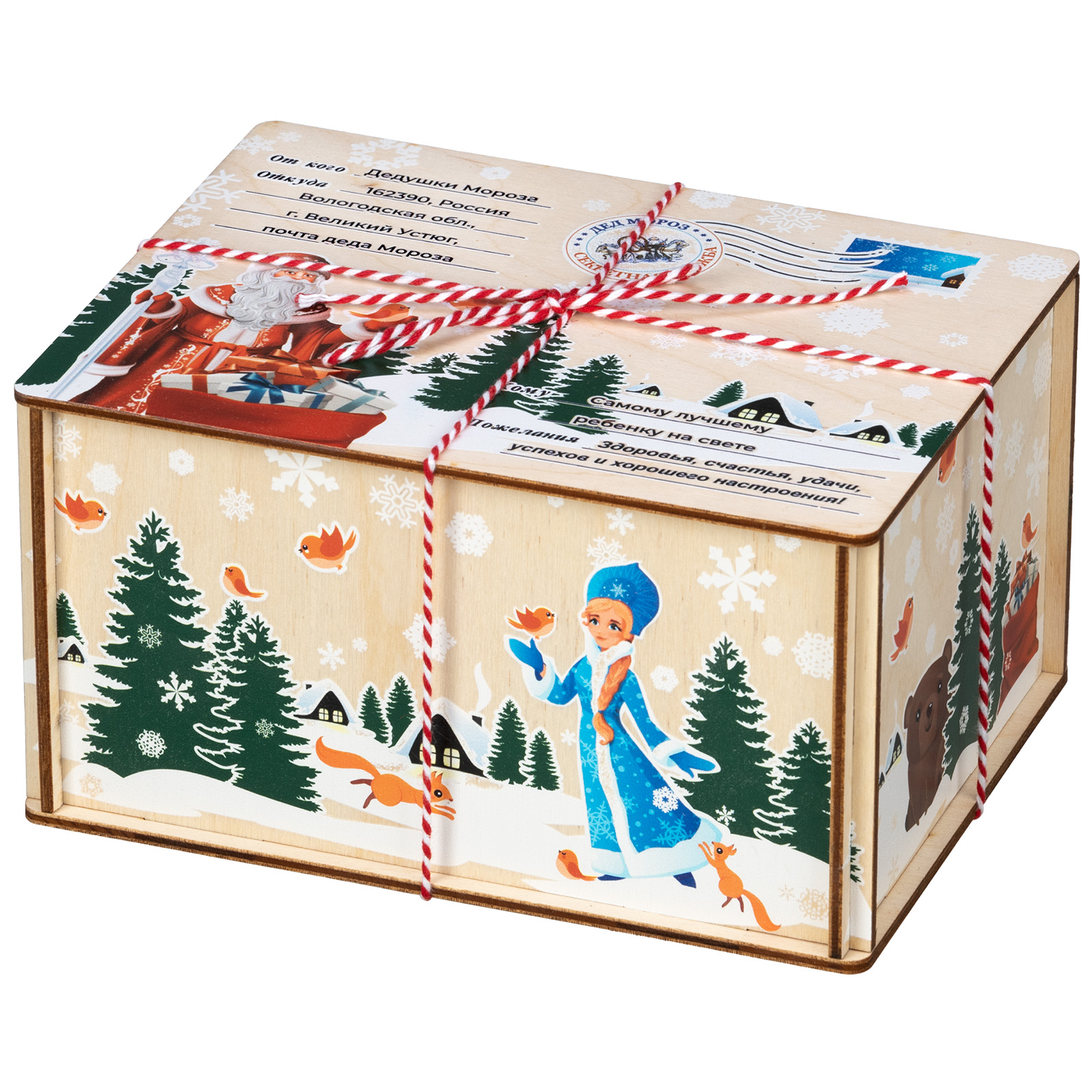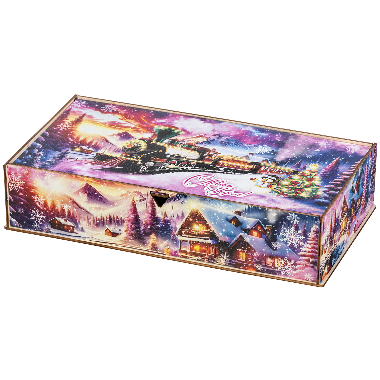 Ағаш қаптама берік фанерден жасалған, оның беті толық түсті басып шығару арқылы жаңа жылдық тақырыптағы басып шығарумен безендірілген. Мұндай дизайндағы тәтті жиынтықтарды балаларға ғана емес, ересектерге де, мысалы, әріптестеріне немесе серіктестеріне де ұсынуға болады.