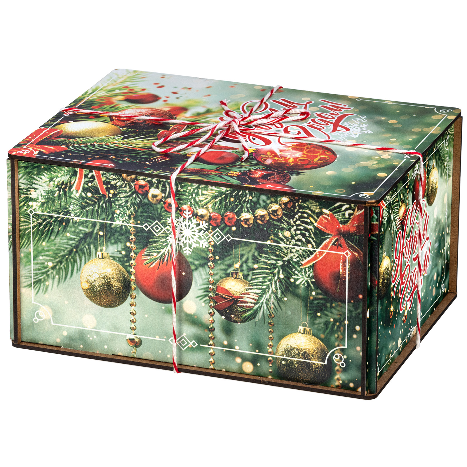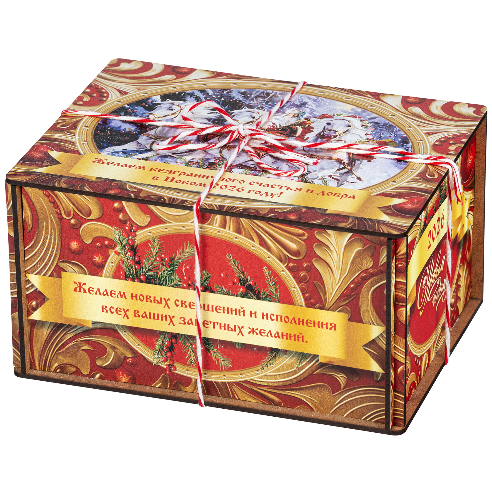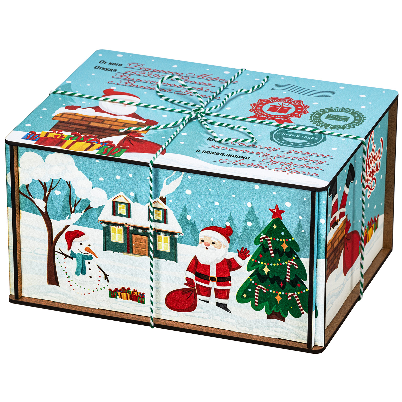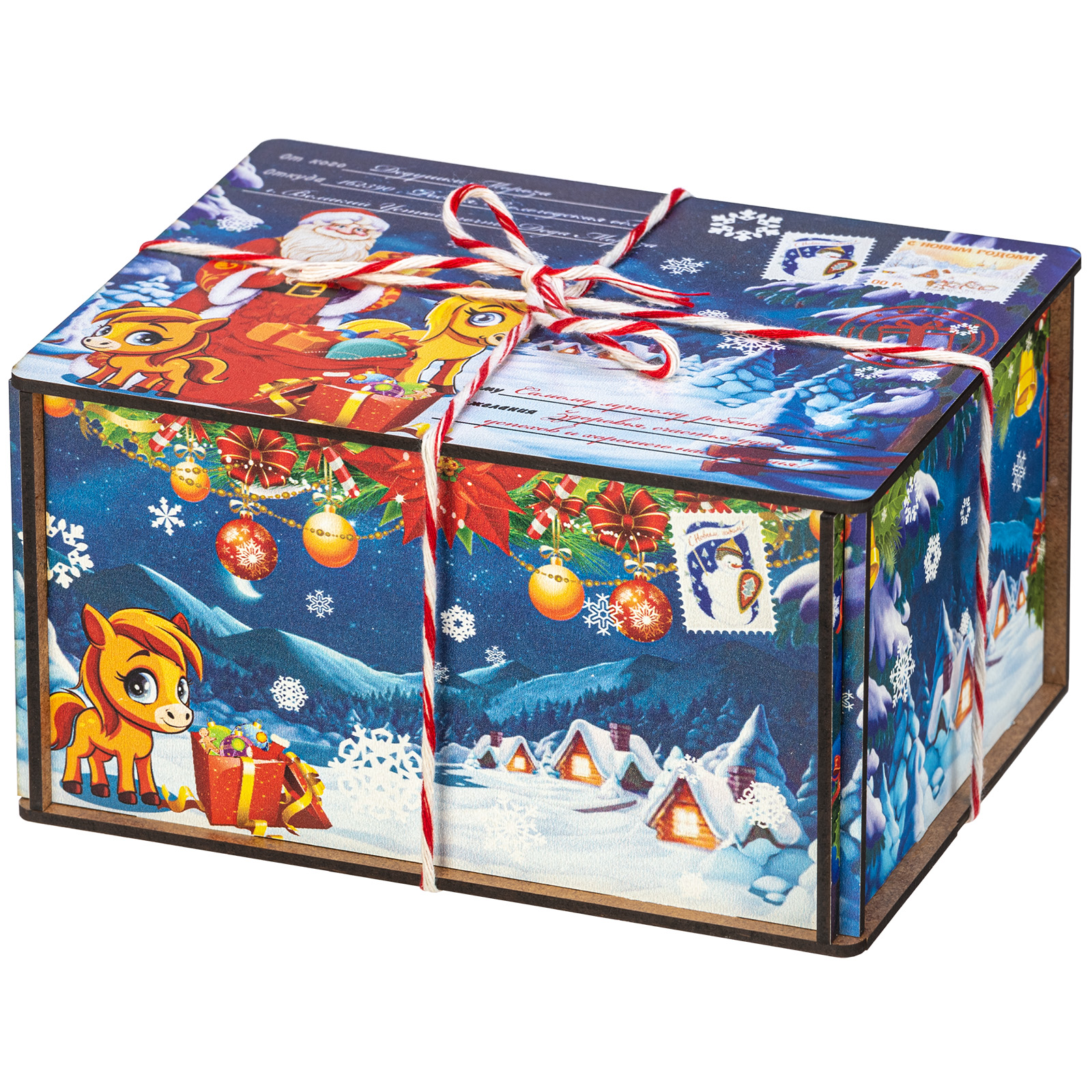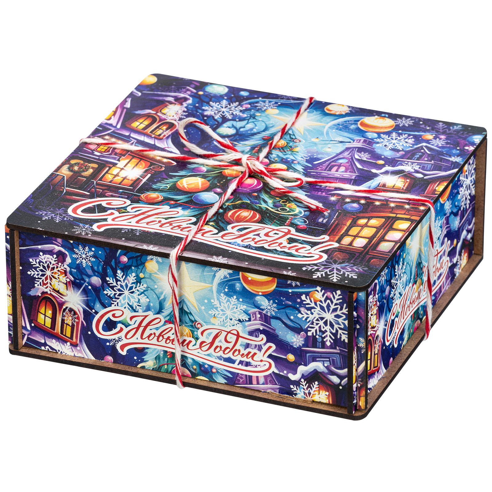 Ағаш қаптама берік фанерден жасалған, оның беті толық түсті басып шығару арқылы жаңа жылдық тақырыптағы басып шығарумен безендірілген. Мұндай дизайндағы тәтті жиынтықтарды балаларға ғана емес, ересектерге де, мысалы, әріптестеріне немесе серіктестеріне де ұсынуға болады.