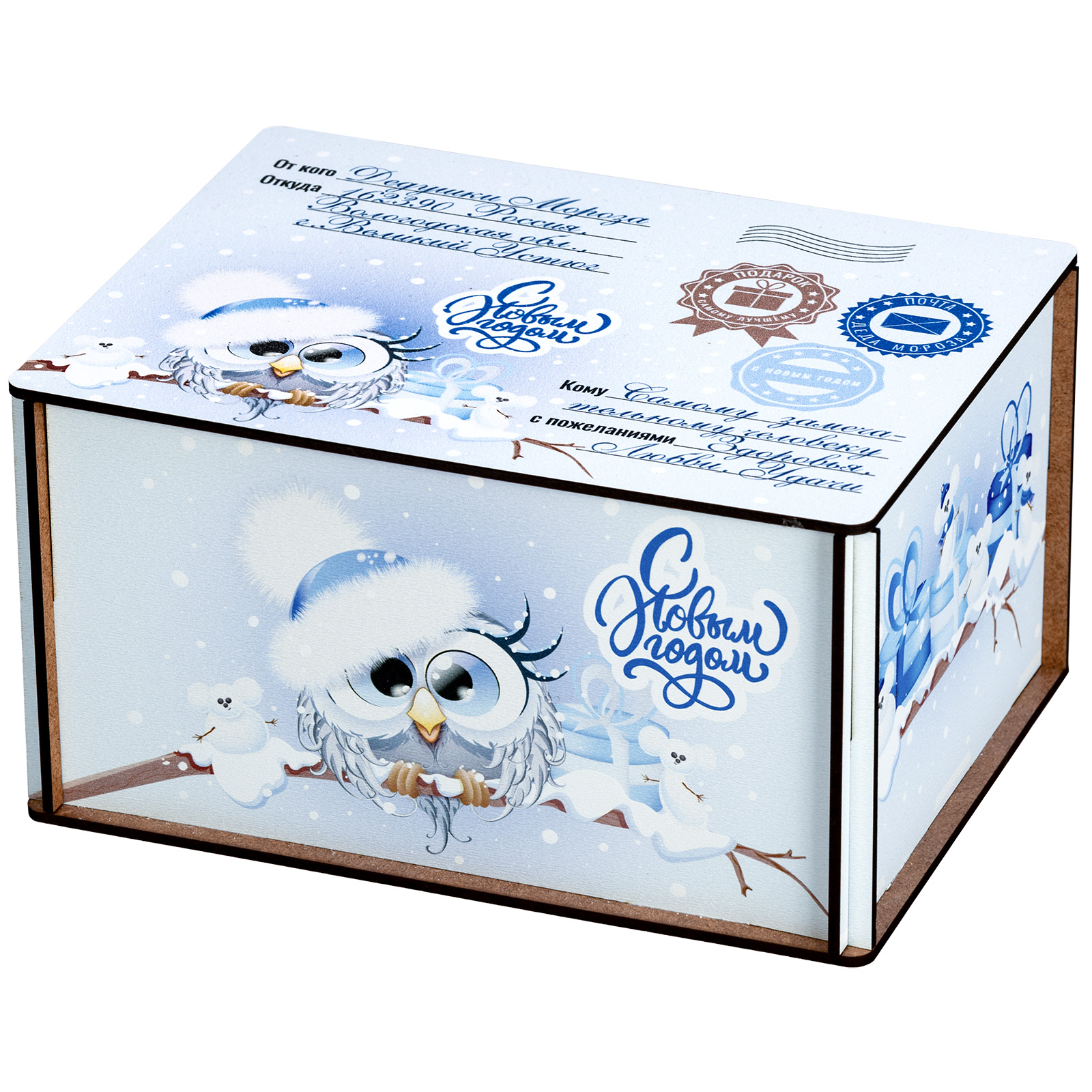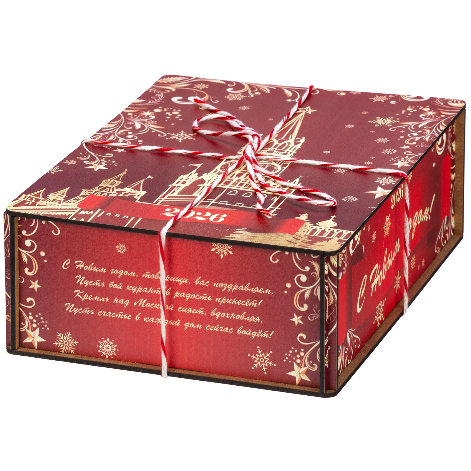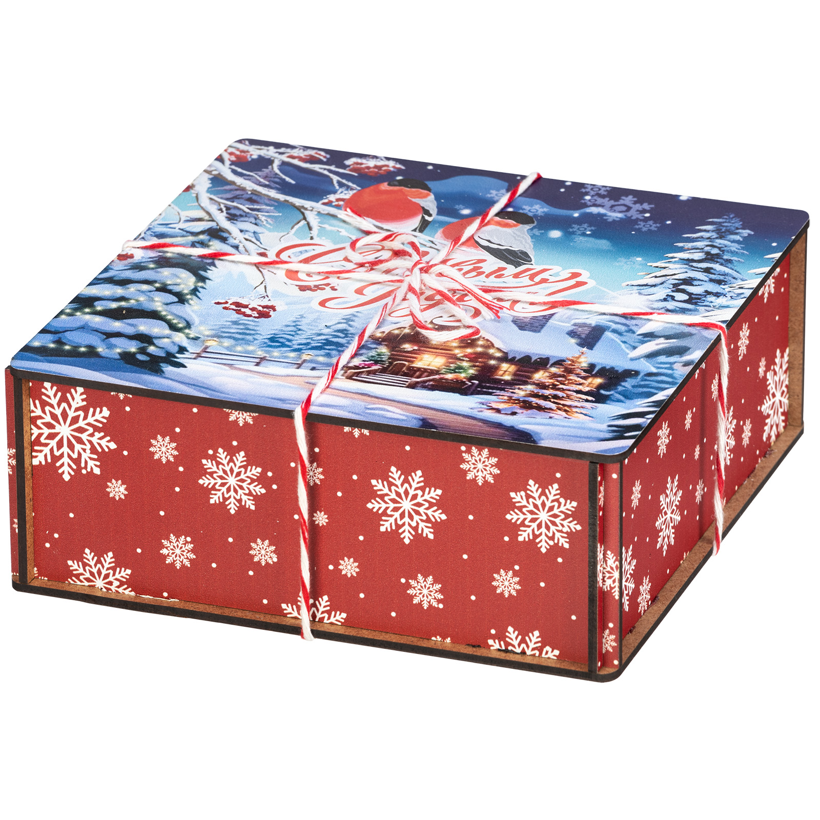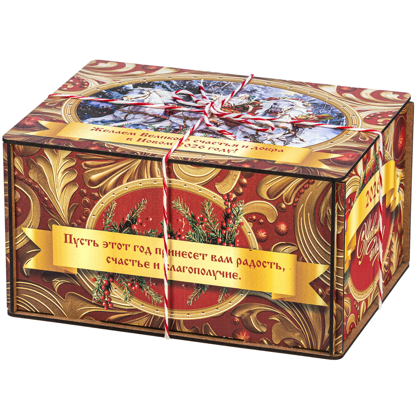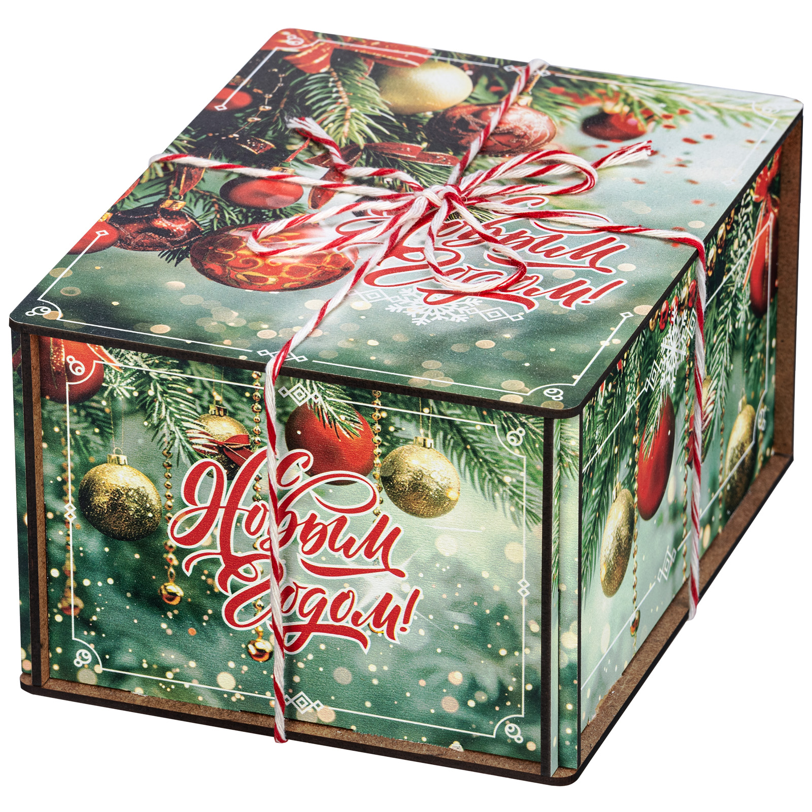 Ағаш қаптама берік фанерден жасалған, оның беті толық түсті басып шығару арқылы жаңа жылдық тақырыптағы басып шығарумен безендірілген. Мұндай дизайндағы тәтті жиынтықтарды балаларға ғана емес, ересектерге де, мысалы, әріптестеріне немесе серіктестеріне де ұсынуға болады.