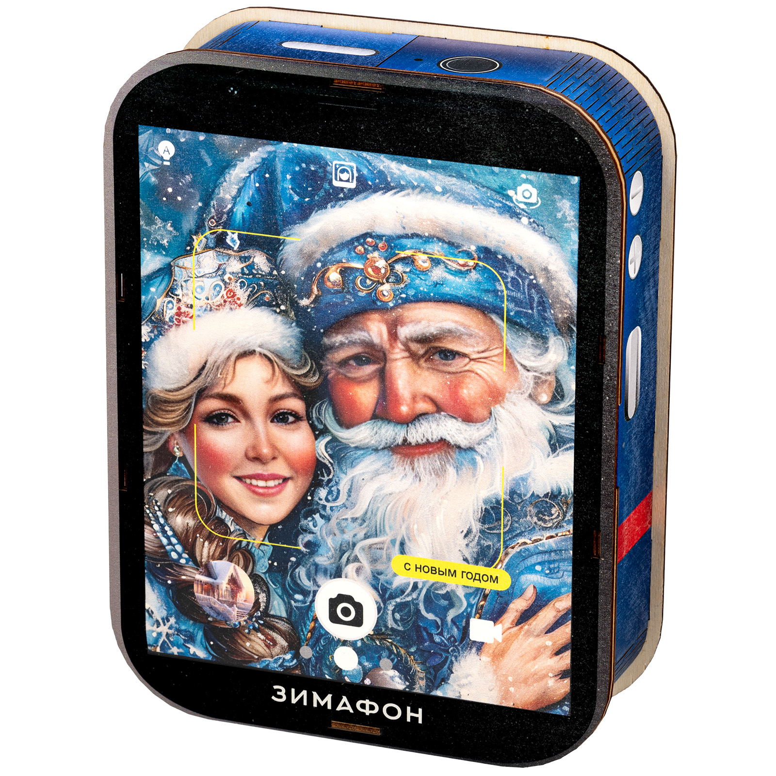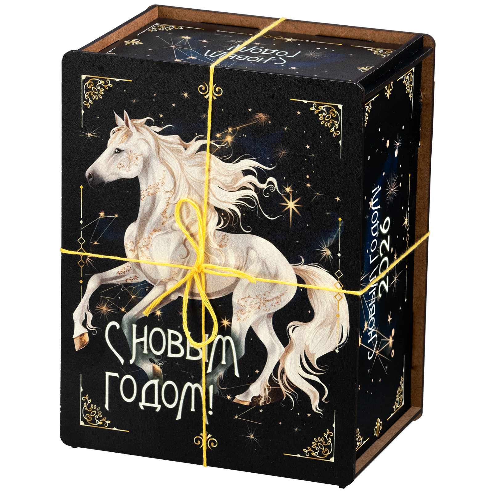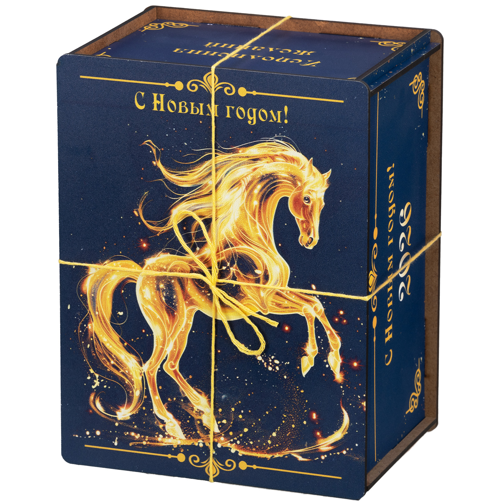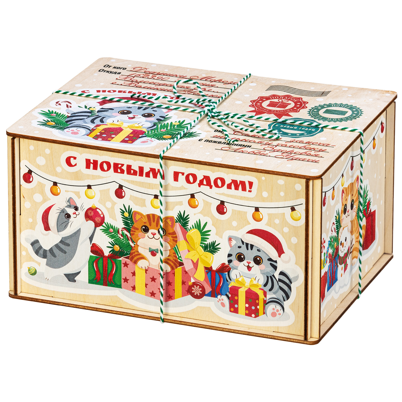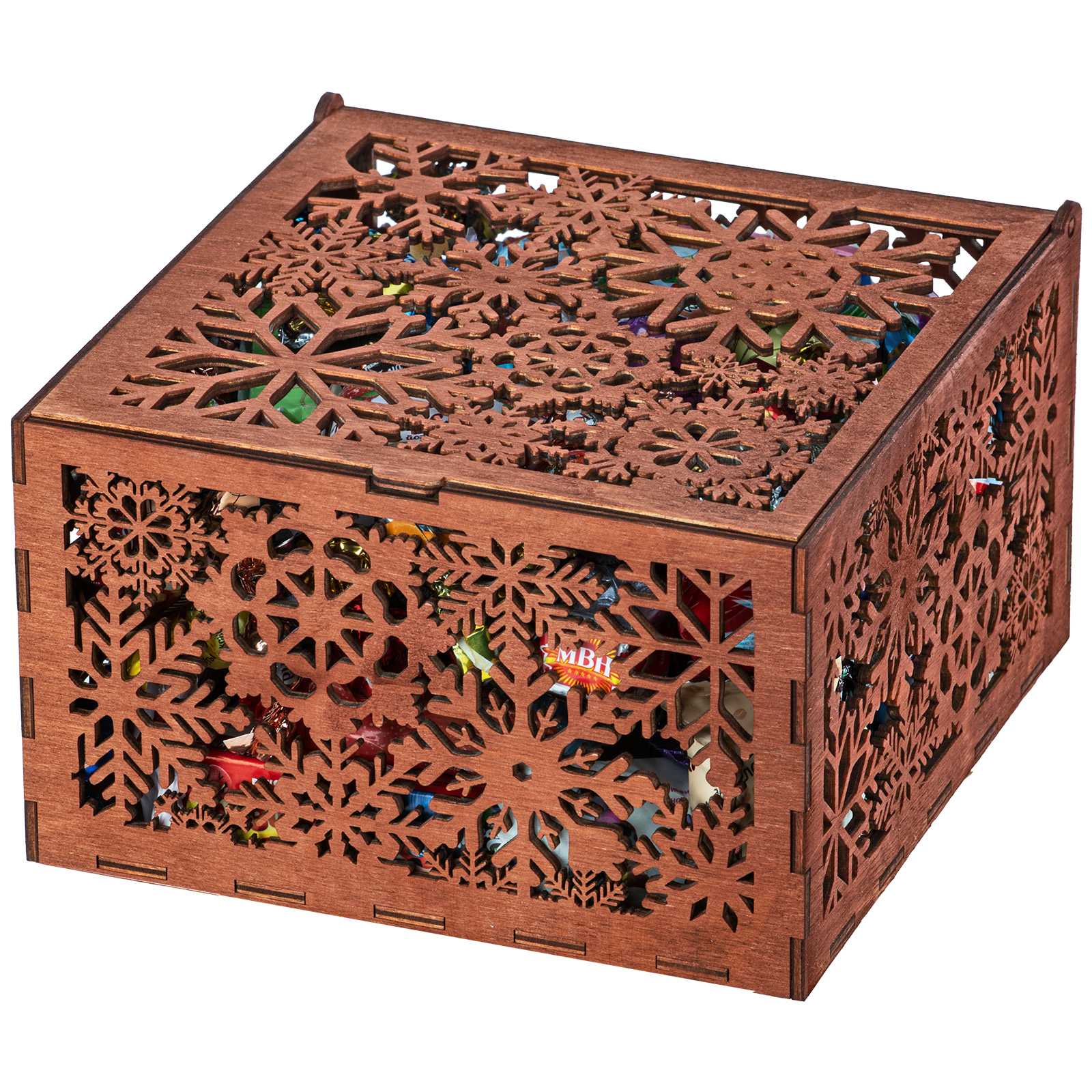 Ағаш қаптама берік фанерден жасалған, оның беті толық түсті басып шығару арқылы жаңа жылдық тақырыптағы басып шығарумен безендірілген. Мұндай дизайндағы тәтті жиынтықтарды балаларға ғана емес, ересектерге де, мысалы, әріптестеріне немесе серіктестеріне де ұсынуға болады.